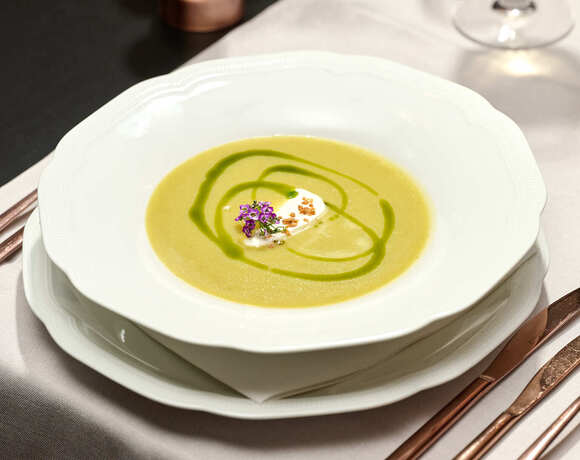 Crema di verdure verdi, panna acida, brioche